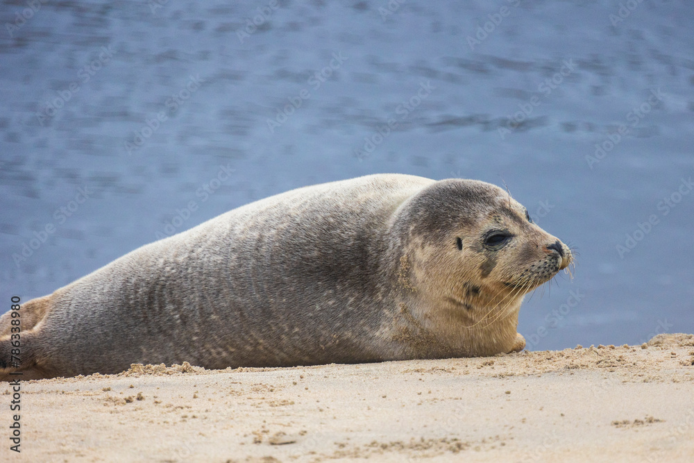A beautiful seal lies on the sand. Blue sea in the background. A seal rests on golden sand. The seal sleeps after eating.