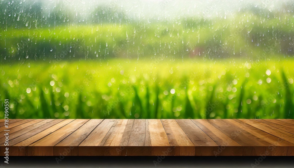 Rustic Rainfall: Perspective View with Raindrops and Green F Wallpaper