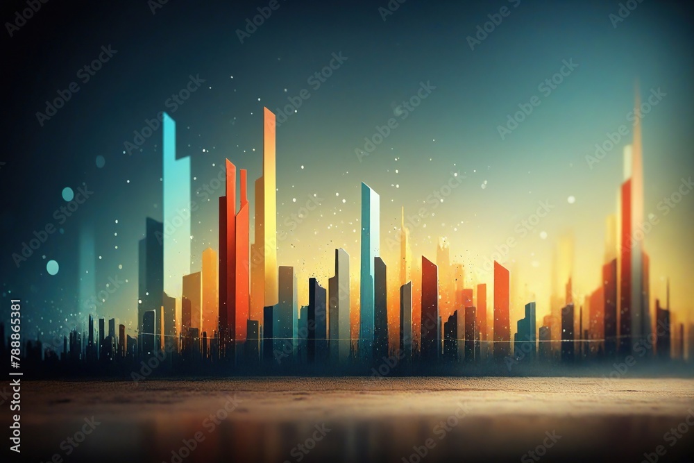 Cityscape overlaid with glowing budget charts, showing the relationship between fiscal policy and urban prosperity, budget control, economic growth