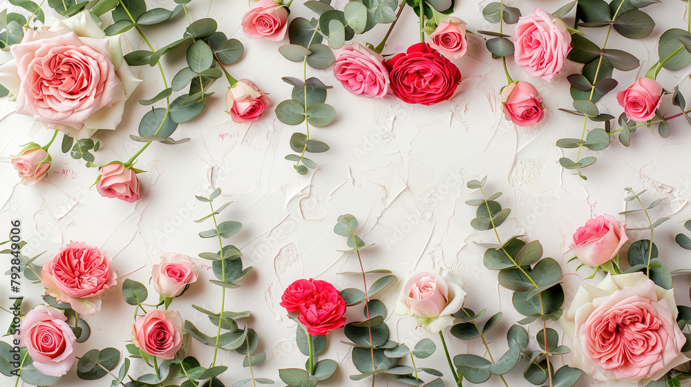 Romantic floral composition with red, pink, and white roses scattered on white background, creating a delicate and elegant pattern for Valentine's Day.