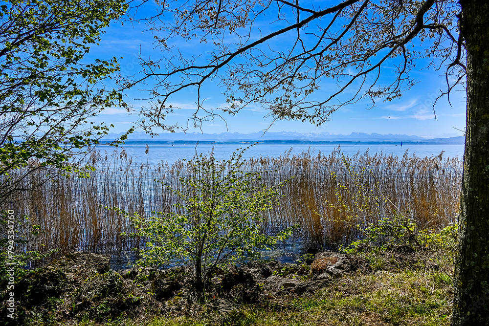 Colombier, Neuenburgersee, Seeufer, Uferweg, Badestrand, Hafen, Wassersport, Wasservögel, Naturschutz, Auvernier, Neuenburg, Seerundfahrt, Frühling, Schweiz