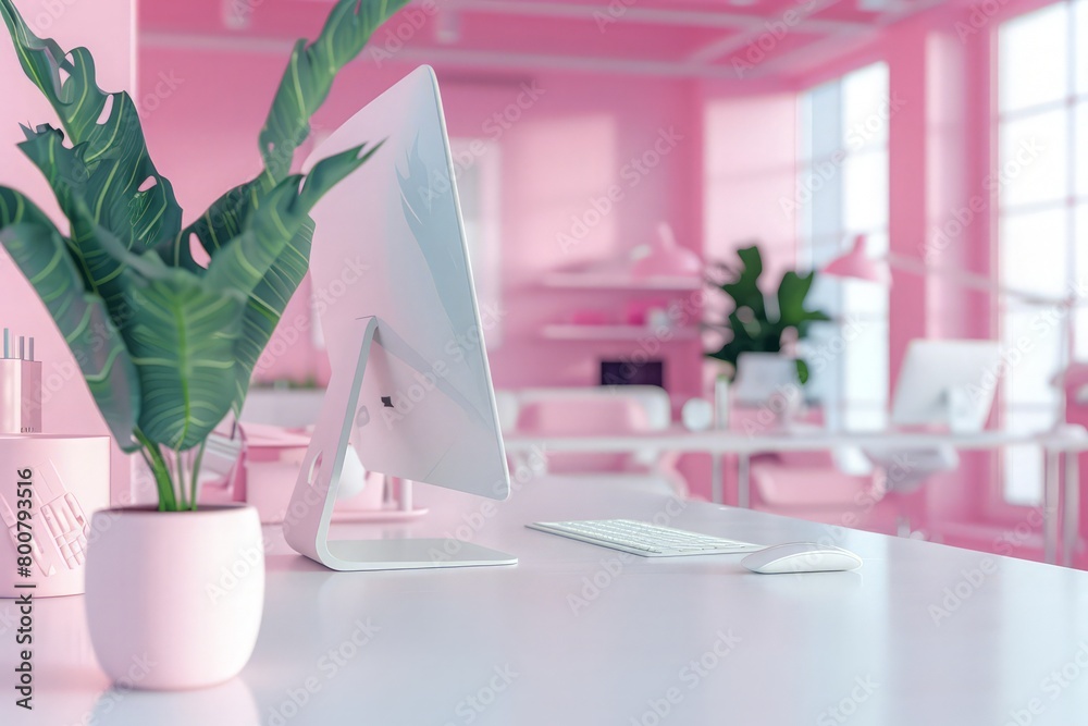Modern stylish pink office workspace interior with copy space on white worktable over blurred office background. 3d rendering, 3d illustration