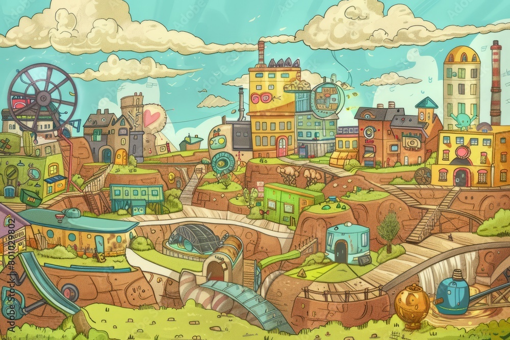 Cartoon cute doodles of a whimsical steampunk cityscape, where adorable characters ride steam-powered bicycles and airships through bustling streets, Generative AI