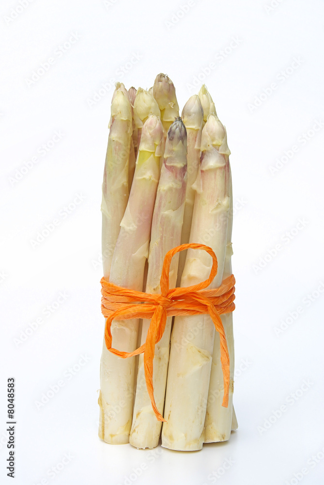 Fresh white asparagus spears wrapped in rustic burlap with twine, organic spring vegetable bundle