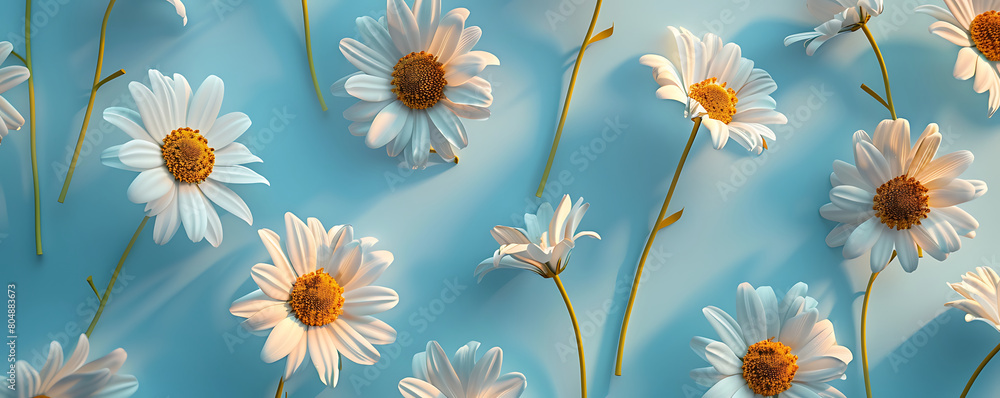 Chamomile daisy flowers with sunlight shadows on neutral blue background with copy space