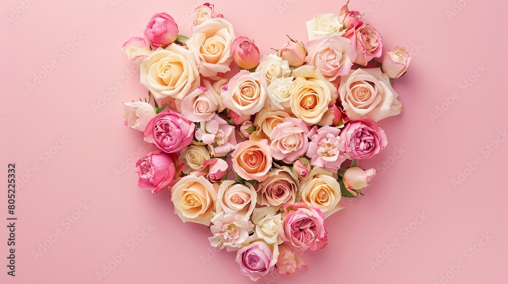 Heart-shaped arrangement of pink and white roses on a pink background.