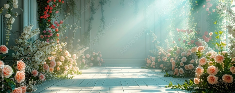 Minimalist wedding interior with blank posters and beautiful black flowers on the walls