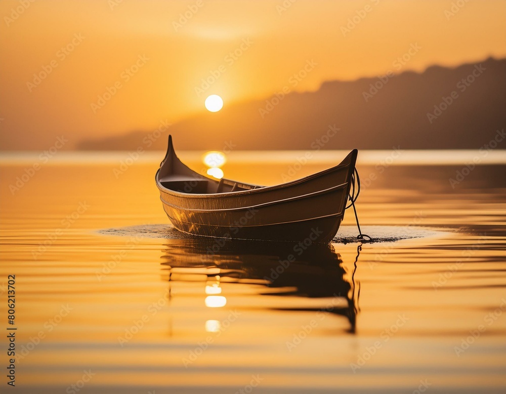 A lone boat silhouetted against a vibrant sunset, reflecting warm hues on the calm waters, symbolizing solitude and connection with nature's magnificence.