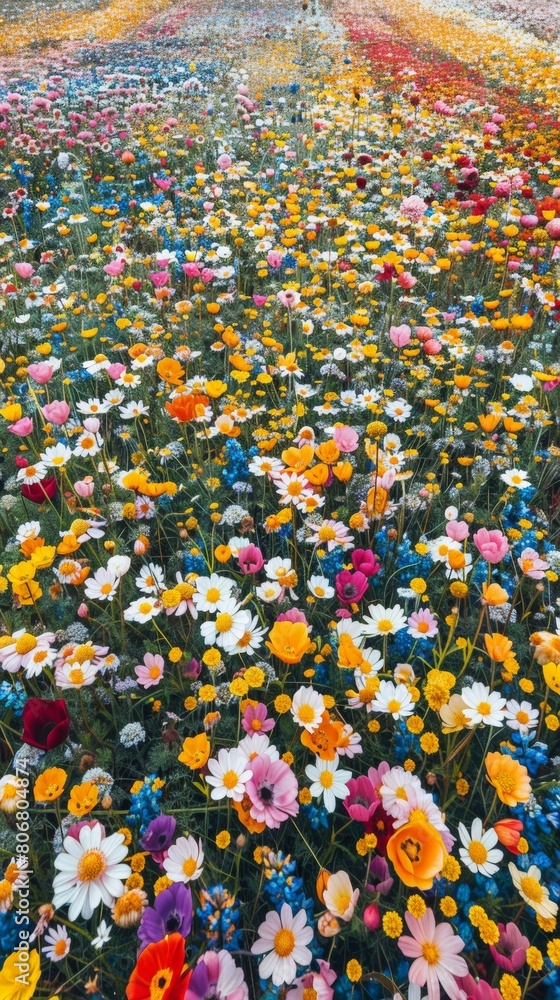 Aerial shot of a vast field of wildflowers in full bloom, patchwork of vibrant colors