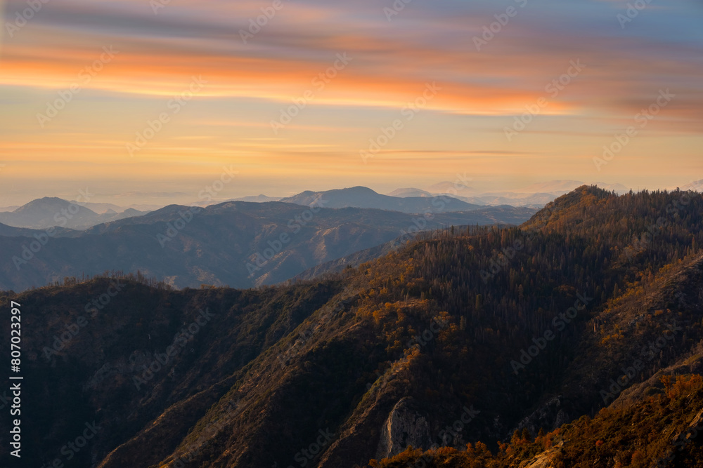 Panoramic sunset view of rolling hills and majestic mountains.