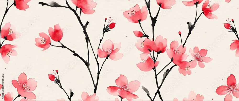 Seamless pattern of blooming cherry blossoms adorning branches, Generative AI