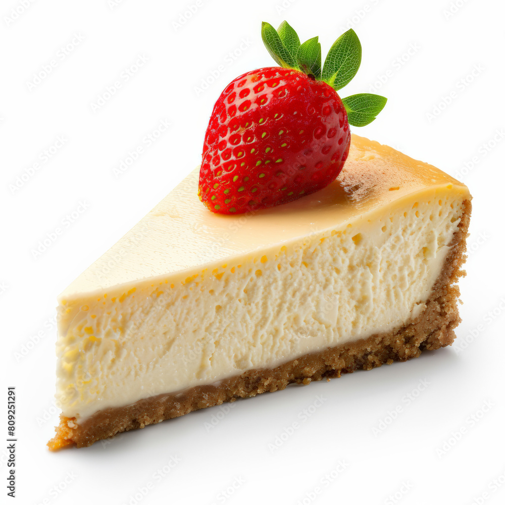 A slice of new York style cheesecake with strawberry isolated on transparent background