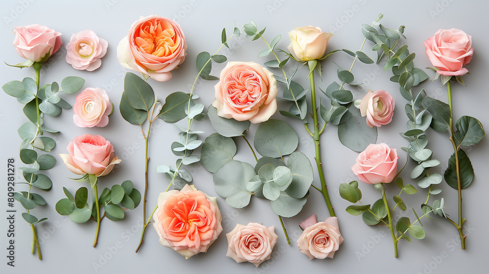 Pink and peach roses with green leaves arranged on a white background. Flat lay composition. Springtime and floral design for greeting card, invitation, poster, wallpaper. Generative AI