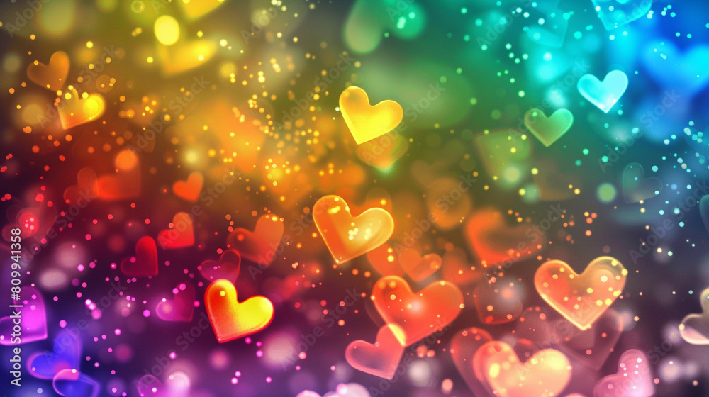 Background of glittering bokeh and shapes of hearts in rainbow colors