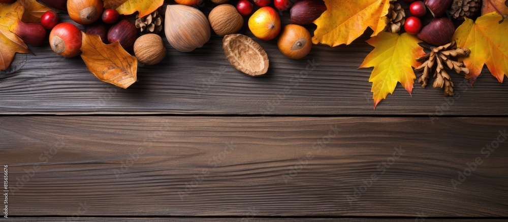 Wooden table background decorated with autumn leaves and fruits creates a scenic copy space image