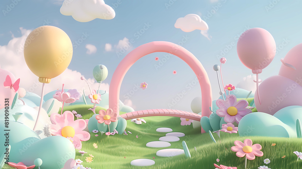 Whimsical, stylized garden scene features soft pastel colors under a bright sky