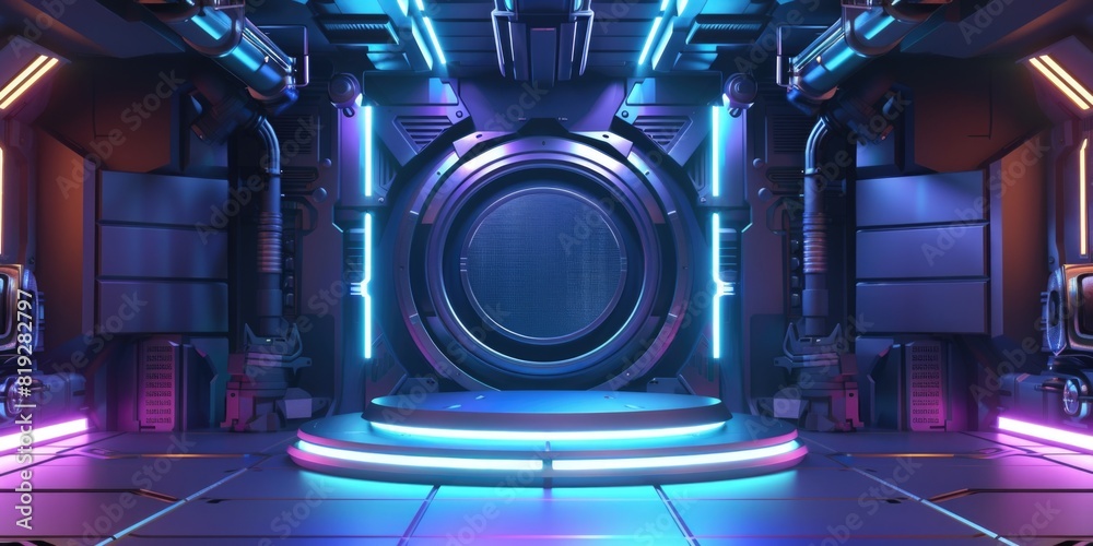 Futuristic Sci-Fi Background with Glowing Neon Lights and Empty Podium. Ideal for product placement, presentations, or game design.