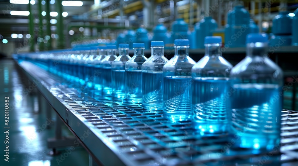 Bottles filled with purified drinking water move steadily along a conveyor belt in a large industrial bottling factory, ensu a clean and efficient process.