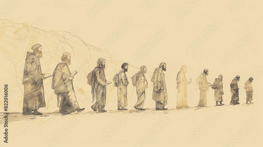 Biblical Illustration Of The Allotment For Simeon: The Leaders Of Simeon Standing Before Joshua, Eager To Receive Their Inheritance, Beige Background