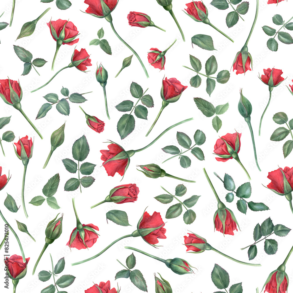 Ruby flowers and green leaves on stems Red roses Seamless pa Wallpaper