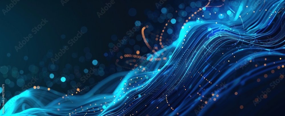 Close Up Horizontal Abstract Illustration Of Glowing Transparent Shiny Waves And Particles