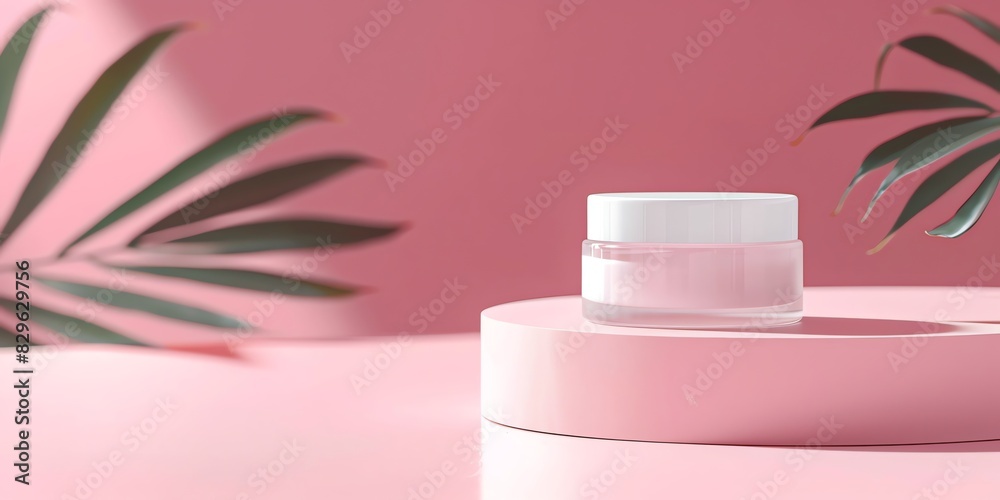 Elegant Skincare Product: A sleek pink skincare jar rests gracefully on a circular pedestal.  Surrounded by palm fronds, the image conveys a sense of luxury and tranquility.