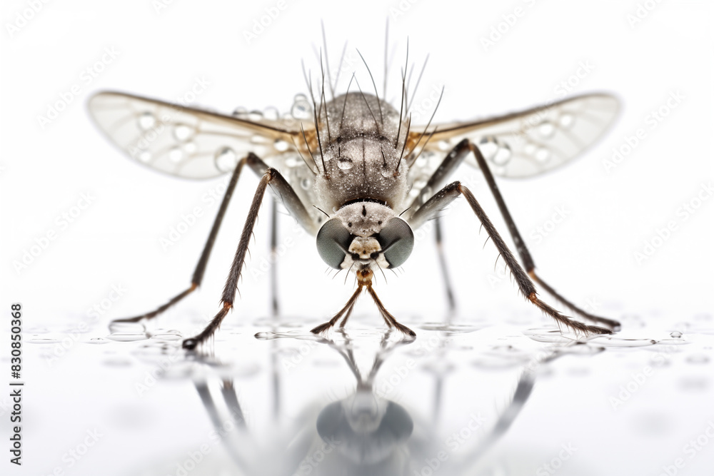 entire mosquito body. A comprehensive model of a macro camera. macro lens with 100mm focal length. Light of day. isolated against a white backdrop. scientific images