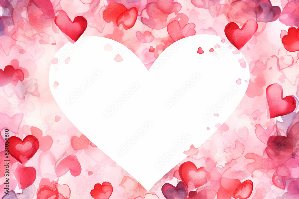 Ein großes Aquarell-Herz in der Mitte, umgeben von kleineren roten und rosa Herzen in einem sanften, verspielten Rahmen. Perfekt für romantische Botschaften. Generative KI.