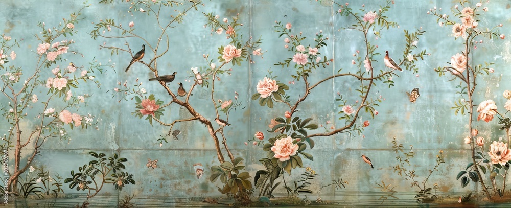 Blossom Tree With Sparrow Finches Butterflies Dragonflies Seamless Wallpaper Mural - Decorly Solutions | Decorly Solutions