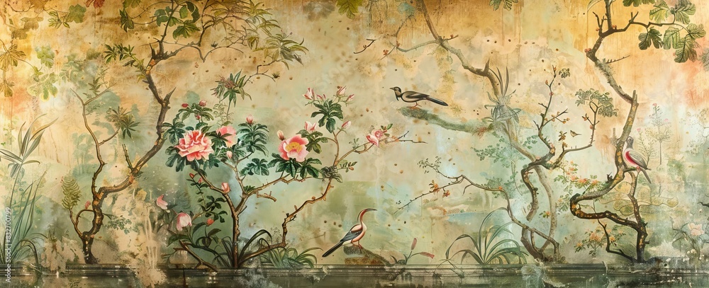 Blossom Tree With Sparrow Finches Butterflies Dragonflies Seamless Wallpaper Mural - Decorly Solutions | Decorly Solutions