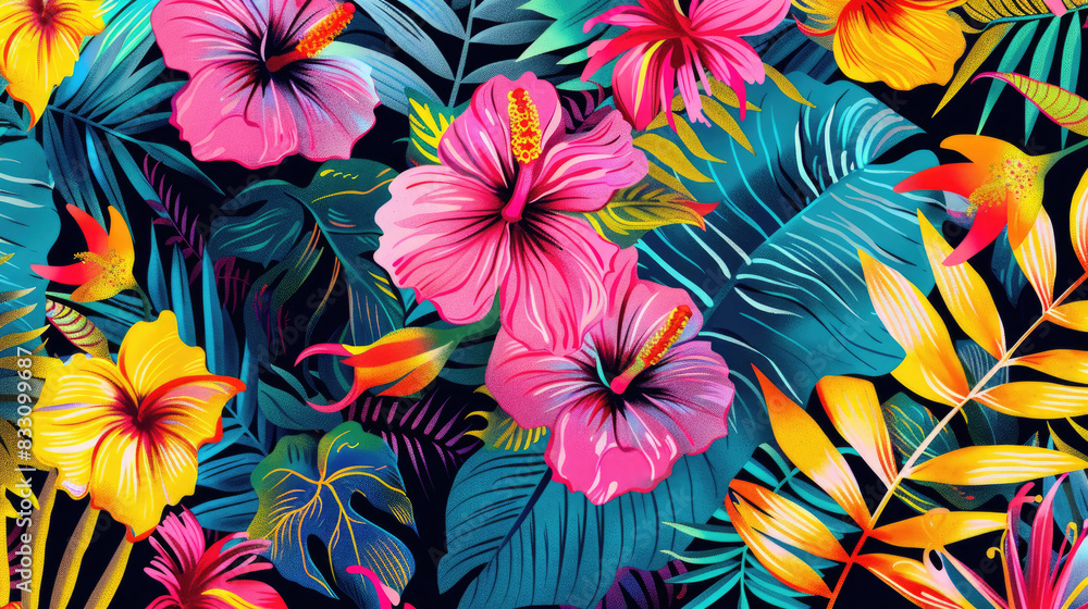 A tropical floral pattern with bright colors.