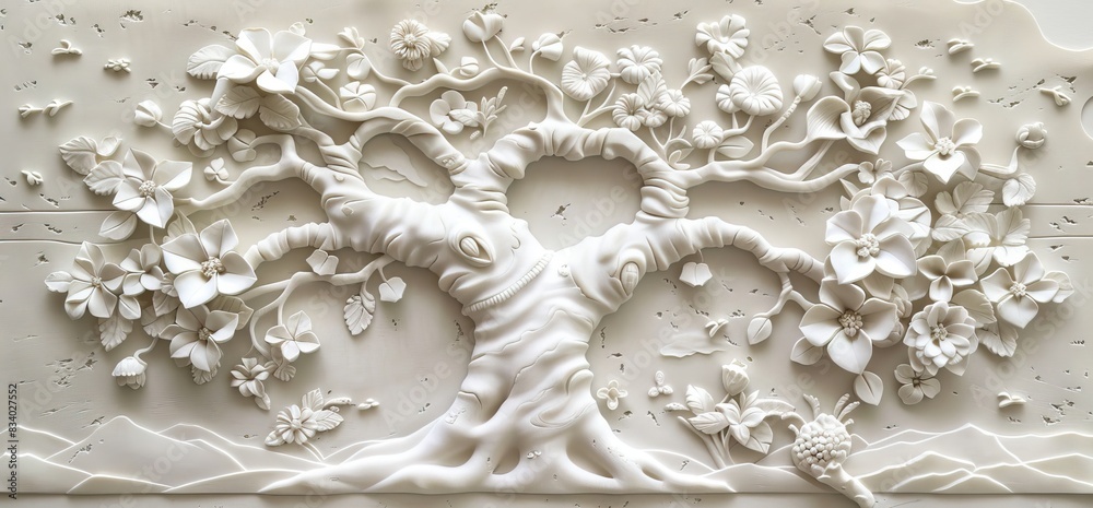 3d Relief White Tree Wallpaper Mural Wall. Ai Generated Illustration