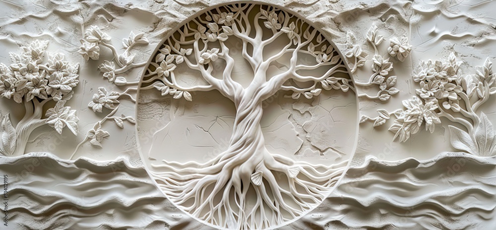 3d Relief White Tree Wallpaper Mural Wall. Ai Generated Illustration