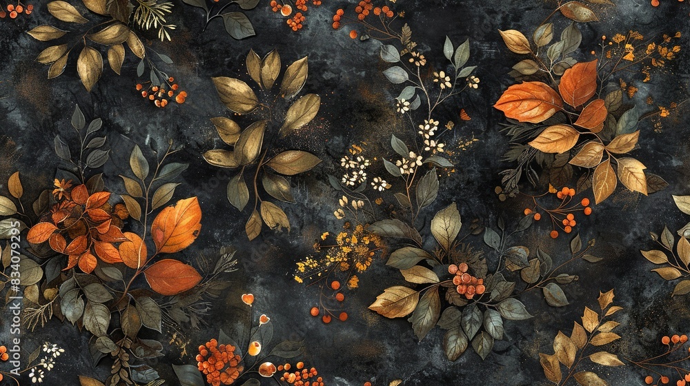 A Painting Depicts Leaves Berries And Orange Yellow Wallpaper Mural - Decorly Solutions | Decorly Solutions