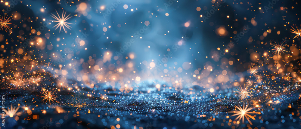 blue christmas background with golden bokeh lights and snowflakes for winter holiday decoration