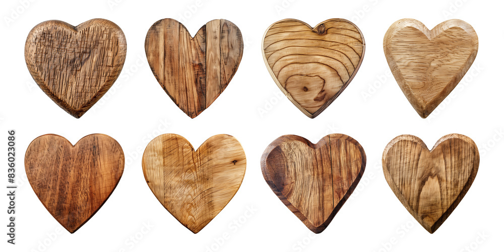 Wooden heart set including various grain patterns, species, and colors isolated. Decorative carvings and romantic craft collection.