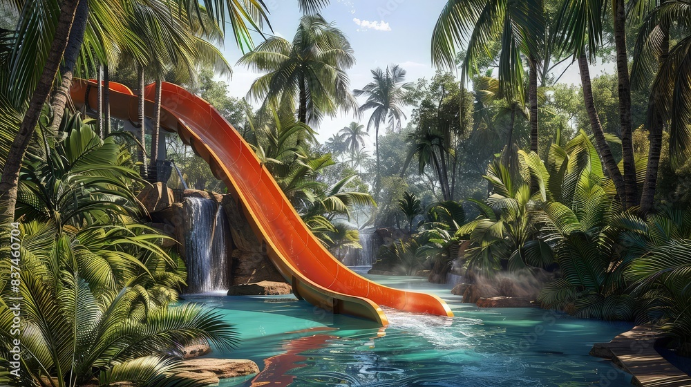 An artistic representation of an orange water slide slicing through a tropical landscape, its end cascading into a sapphire blue pool surrounded by palm trees.