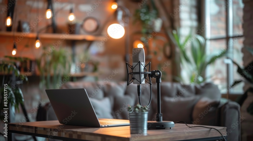 A laptop sitting on a table with microphone and lamp AI Wallpaper