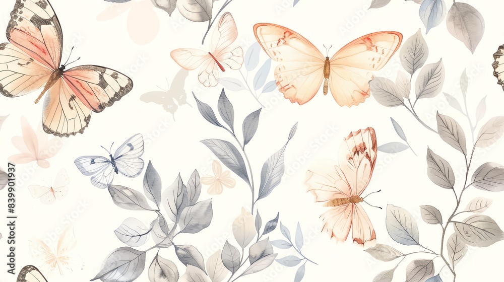 Soft pastel-colored butterflies and leaves, hand-drawn seamless floral pattern