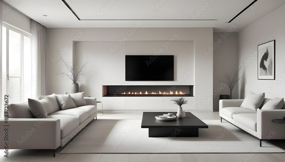 A Minimalist Living Room Featuring A Light Gray Sofa, A Flat-screen Tv Mounted On A White Wall, And A Large Window Allowing Natural Light To Flood The Space.
