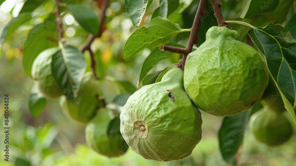 Green guavas growing on a branch in tropical orchard