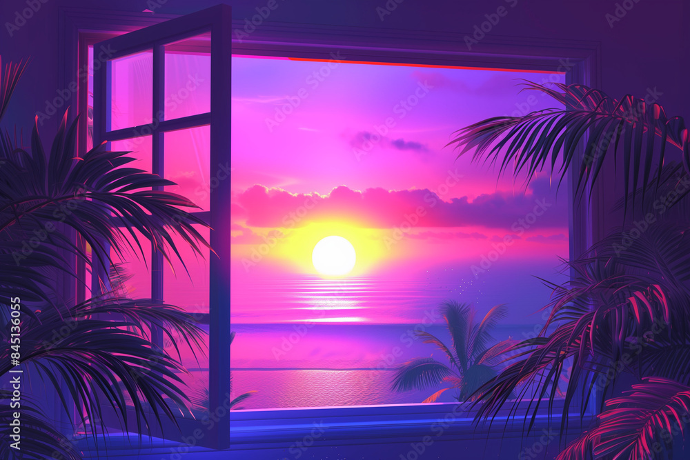 Open window with tropical landscape and ocean in vaporwave style. Purple sundown in 90s style room