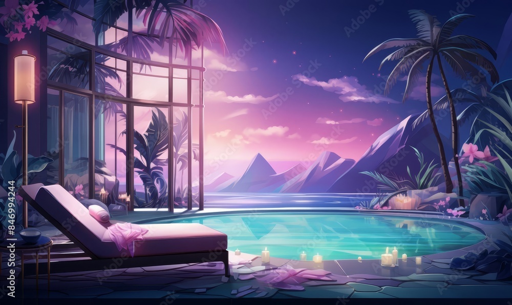 Luxury lifestyle spa flat design, side view, relaxation retreat, cartoon drawing, tetradic color scheme