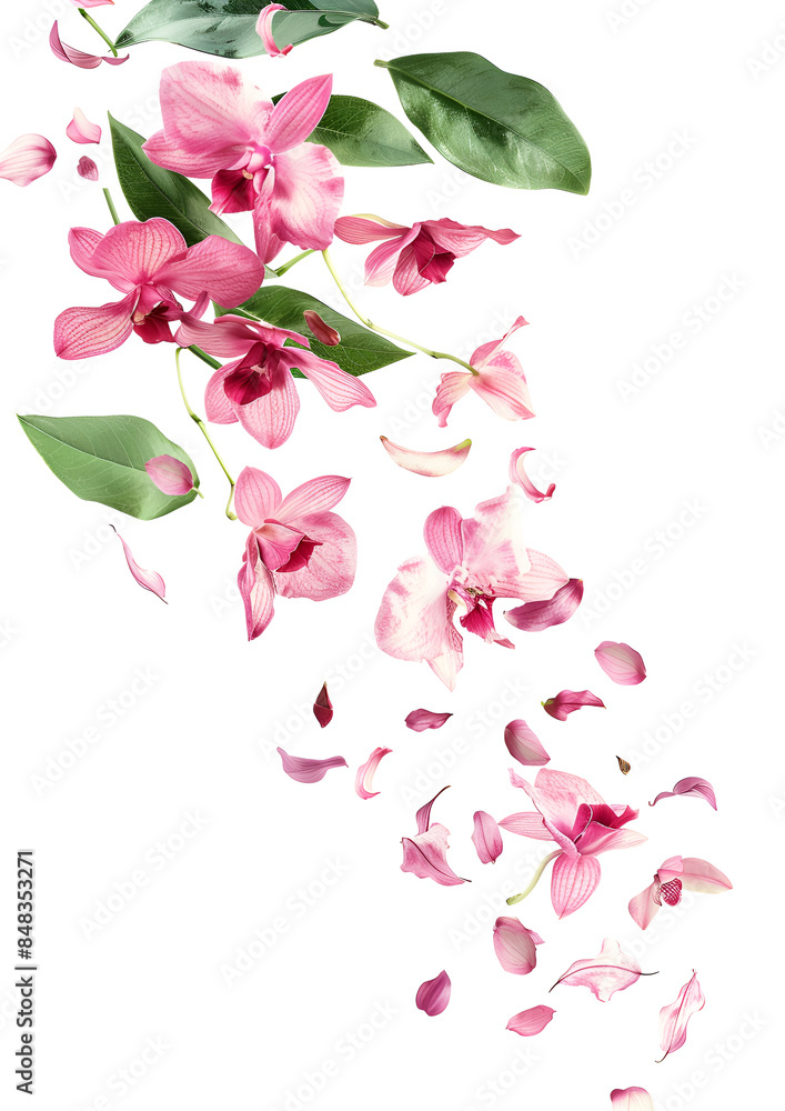 Fresh Flying Pink Orchids And Leaves Isolated On Wallpaper Mural - Decorly Solutions | Decorly Solutions