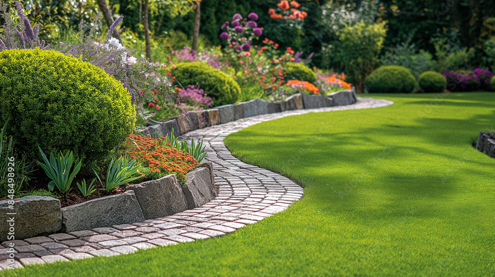 Serene Garden Pathway with Lush Green Lawn and Vibrant Floral Borders