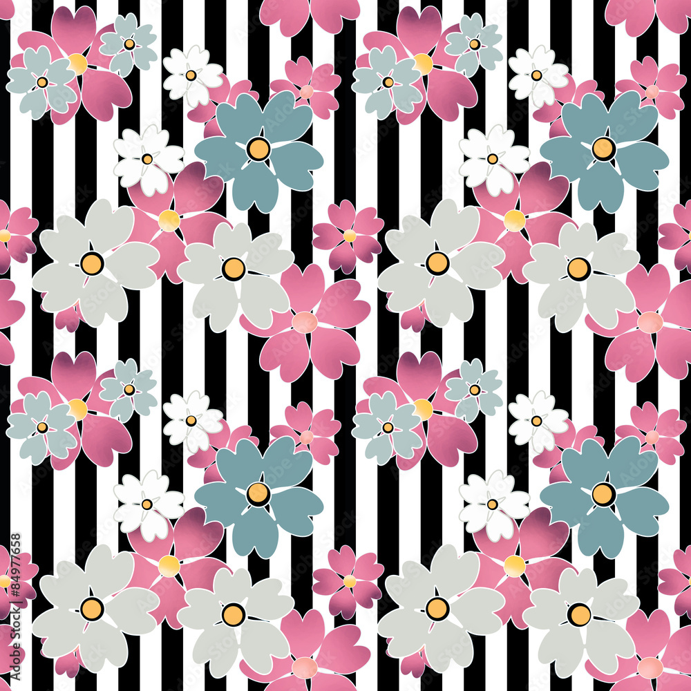 Seamless Cute Cartoon Flowers Pattern On Striped Background Wallpaper Mural - Decorly Solutions | Decorly Solutions