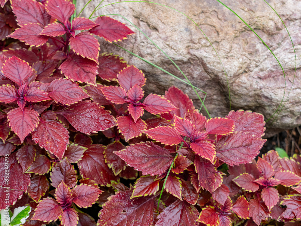 Coleus plant in the garden. Decorative leaves in red and black. Decorative flower. Blooming windowsill. Coleus grade Religious Radish.