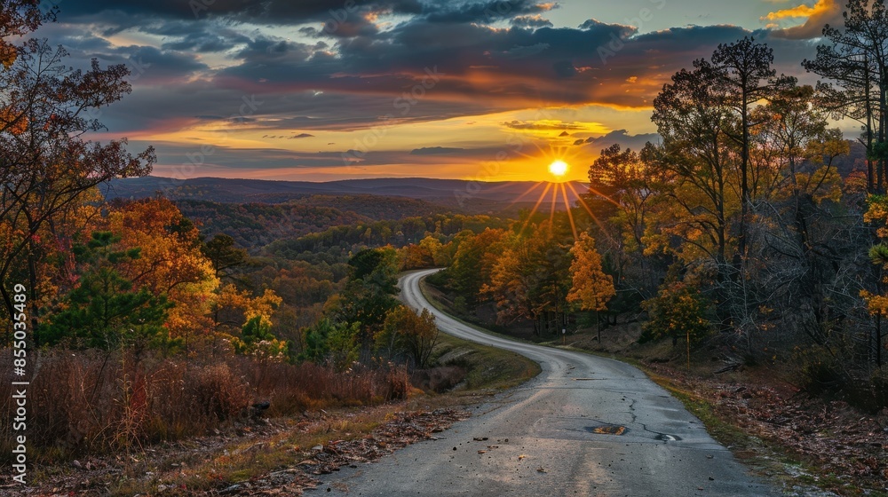 Colorful Sunset Over Winding Road Through Scenic Forest Wallpaper Mural - Decorly Solutions | Decorly Solutions
