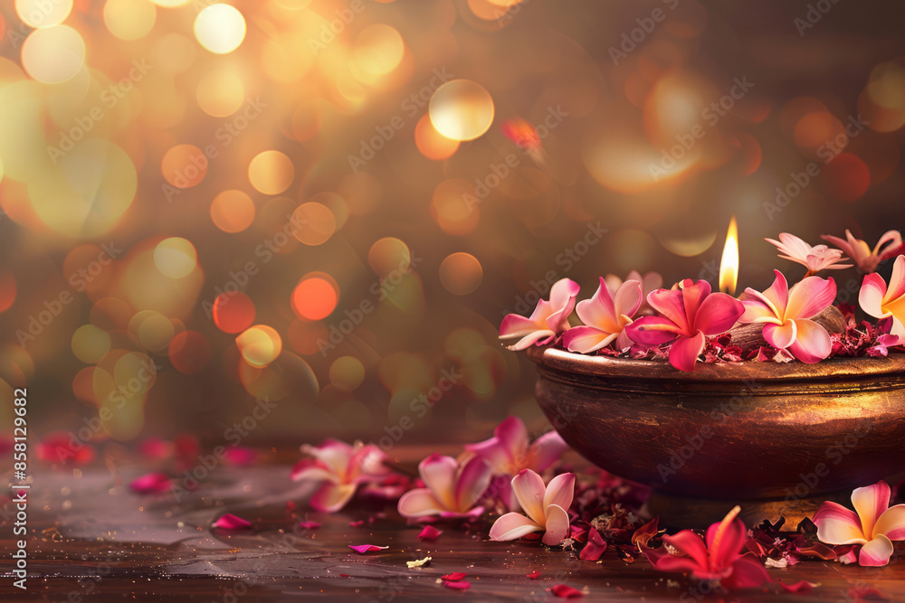 Realistic depiction of an urli bowl and flowers on a Diwali background, with space for text,