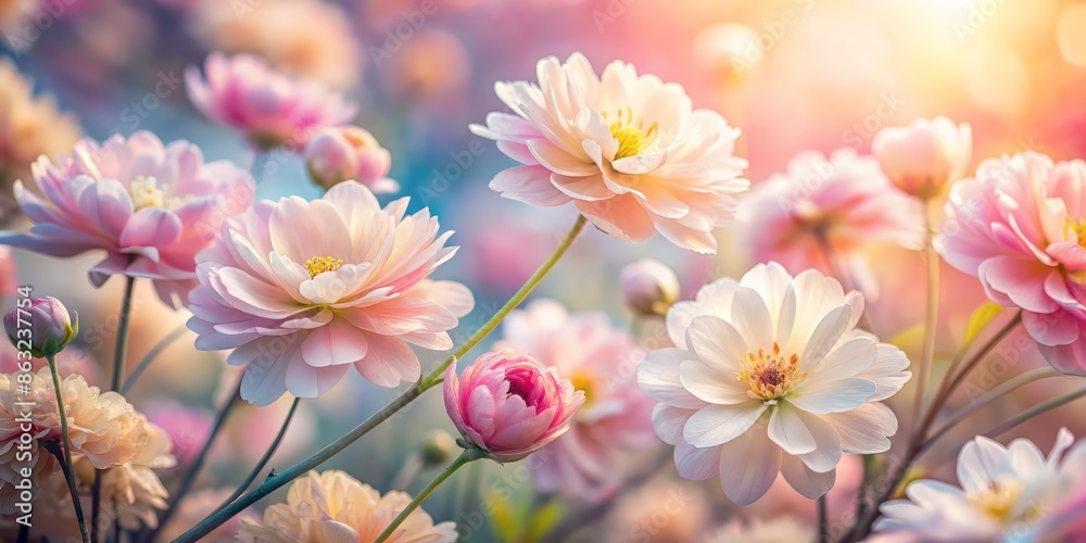 Vibrant, pastel, soft, dreamy, ethereal, and beautiful floral, flower spring background. Backdrop for cosmetics, spa, perfume, beauty salon, florist shop, invitation, gift cards